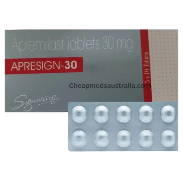 Apresign 30 Mg contains Apremilast and is used for plaque psoriasis, psoriatic arthritis, and mouth ulcers. It works by controlling inflammation and immune response. It helps reduce skin irritation, joint pain, and swelling. Common side effects include nausea, diarrhea, headache, and weight changes. Use as directed.